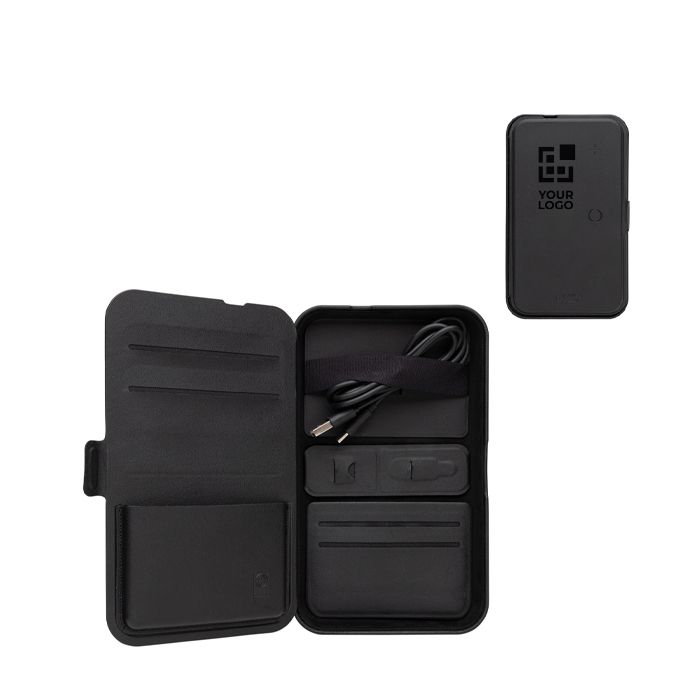 - Étui élégant en polyester recyclé avec fonctionnalité de charge 3 en 1, idéal pour les déplacements professionnels.