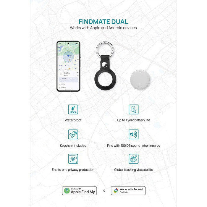 Traceur d’objets premium fabriqué en ABS recyclé avec certification RCS. Compatible avec le réseau Apple Find My et Android Find Hub, il permet de localiser en temps réel clés, portefeuilles, sacs, bagages ou même animaux de compagnie. Il garantit la sécurité grâce au chiffrement de bout en bout d’Apple et Google. Il intègre un haut-parleur avec alarme très puissante de 100 dB pour faciliter la localisation à courte distance. Résistant à l’eau avec certification IPX5, il possède un porte-clés en PU qui assure durabilité. Il inclut le mode Perdu pour recevoir des notifications lorsque des objets sont oubliés. Fonctionne avec une pile CR2032 remplaçable offrant jusqu’à un an d’autonomie. Présenté dans un emballage certifié FSC.
