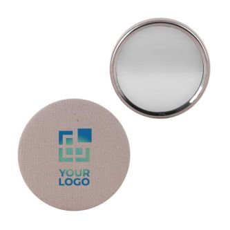 Miroir de poche rond élégant avec finition textile à l'arrière.