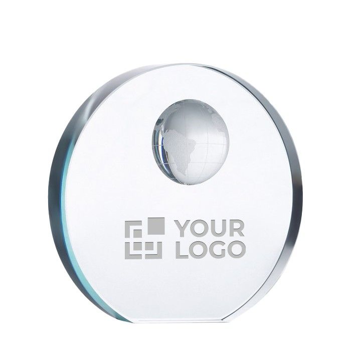 Trophée en verre élégant avec globe terrestre, pour distinctions internationales.