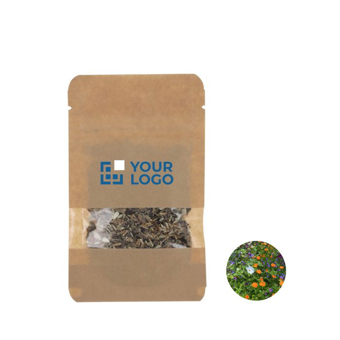 Sachet de graines de fleurs en papier kraft, cadeau écologique personnalisé.