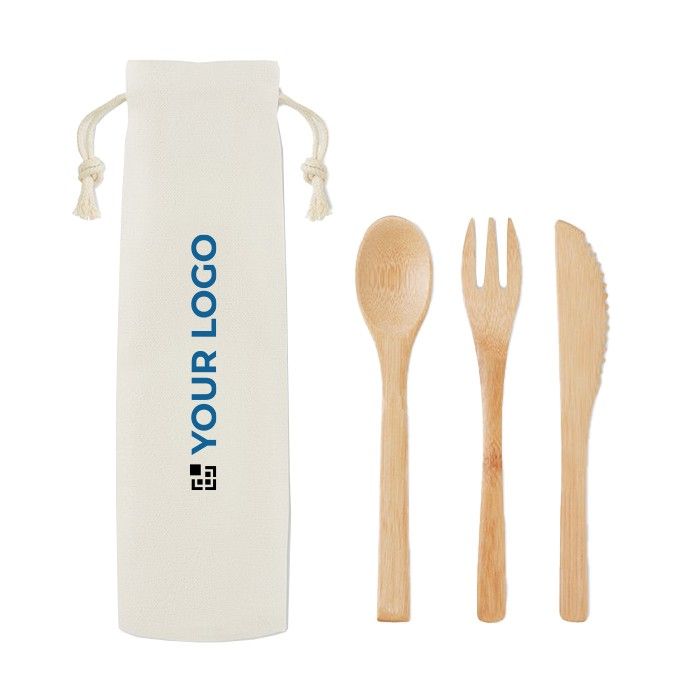 - Ensemble de couverts publicitaires en bambou naturel avec sac en toile, idéal pour une communication écoresponsable.