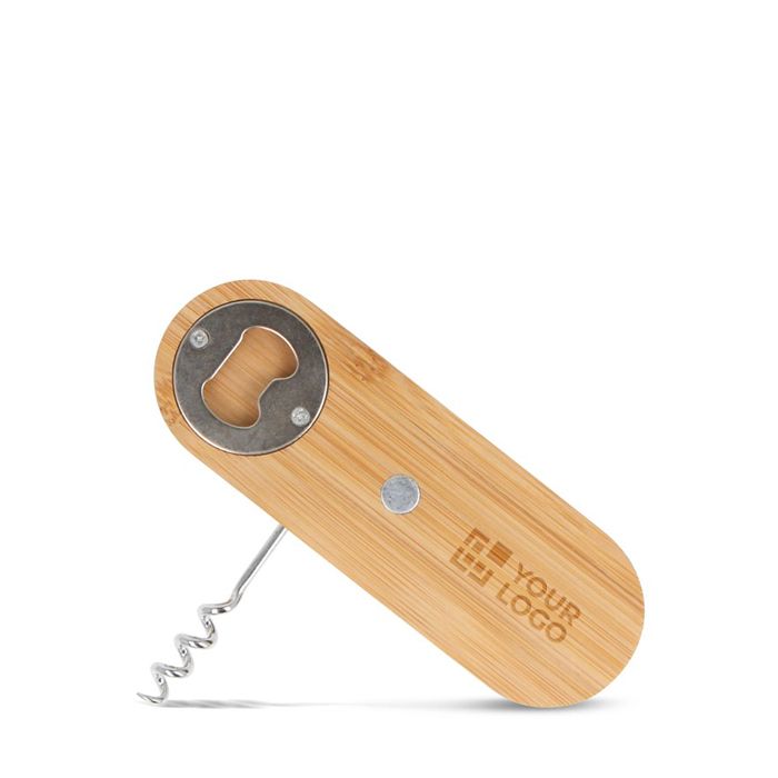 Ouvre-bouteille en bambou élégant, pratique et personnalisable pour entreprises.