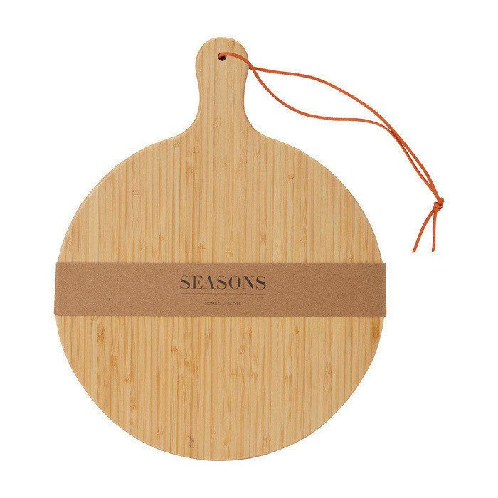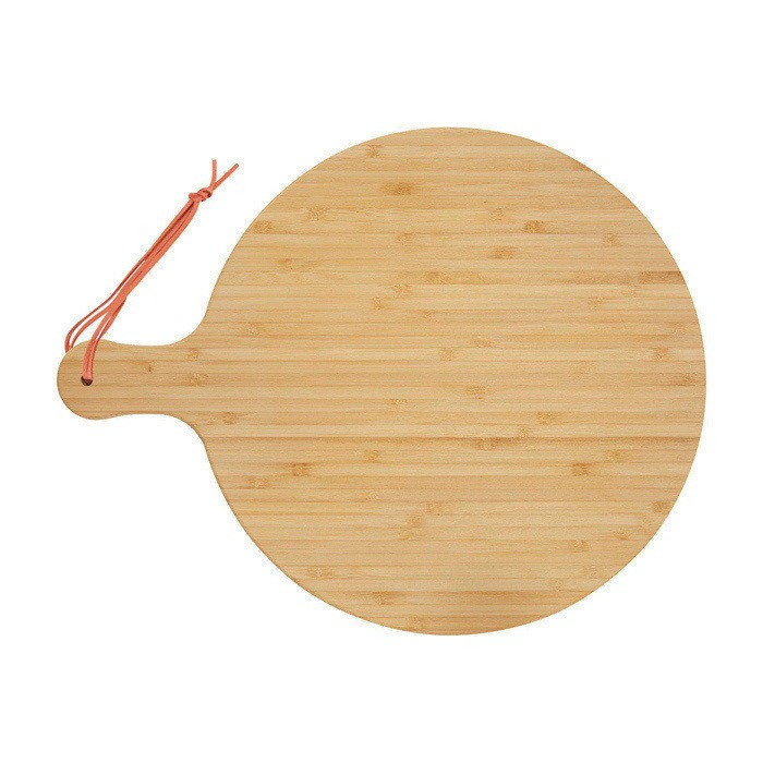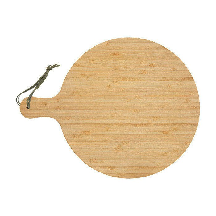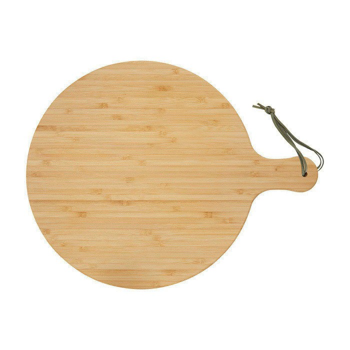 Planche à découper en bambou, option pratique et durable pour un usage quotidien. Diamètre 30,5 cm, manche de 8 cm de long, épaisseur 1,4 cm. Non compatible lave-vaisselle ni micro-ondes ; lavage à la main recommandé.