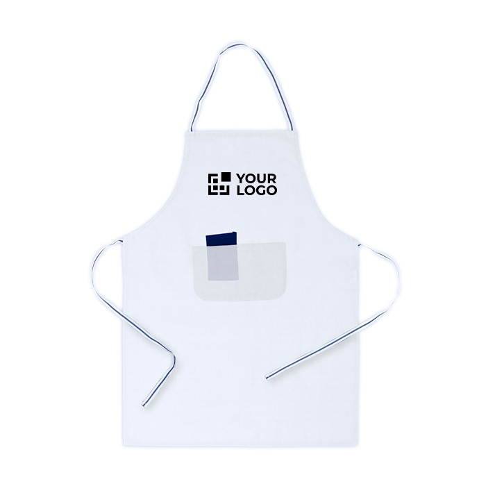Tablier long en mélange coton-polyester, perçu comme un cadeau de haute qualité. Il est doté d'une double poche frontale et d'attaches bicolores.