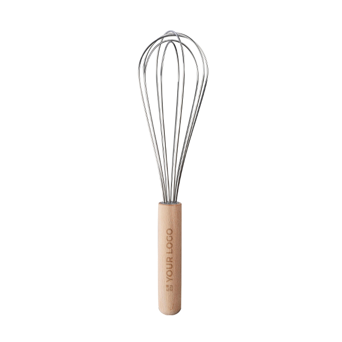 Fouet manuel en acier inoxydable avec manche en bois de hêtre. Un cadeau pratique au quotidien qui rapproche votre marque des cuisines de vos clients et employés.