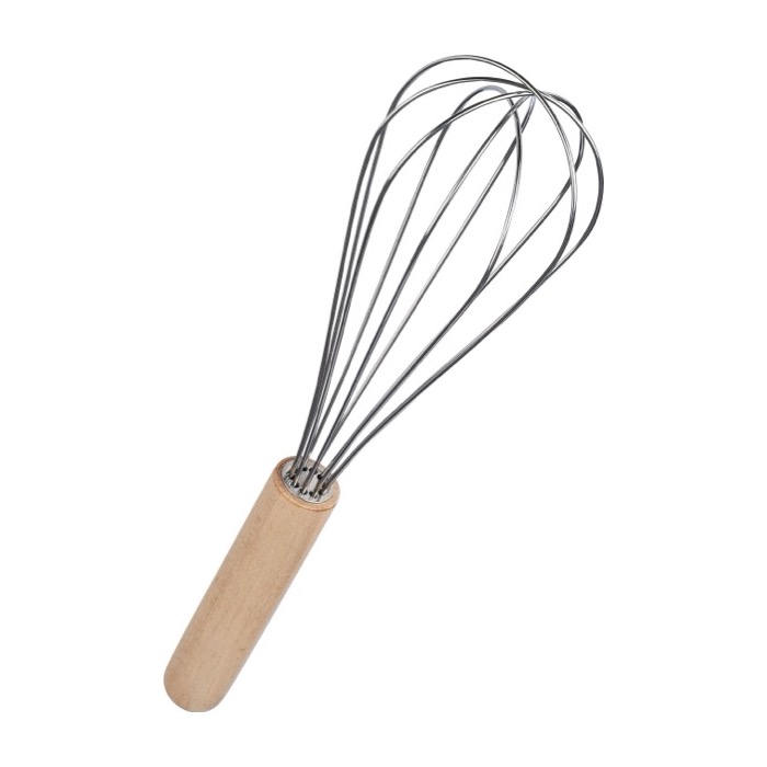 Fouet en acier inoxydable avec manche en hêtre, idéal pour la cuisine quotidienne. Fourni en vrac.