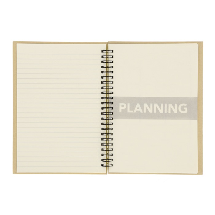 Carnet planificateur mensuel, format supérieur au A5. Couvertures rigides en carton recyclé. Contient : 80 pages crème lignées avec découpe facile, 13 pages de calendrier mensuel non daté, 2 pages de notes lignées.