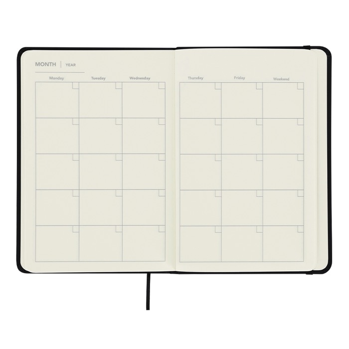 Planificateur mensuel à couverture en PU souple et bande élastique, légèrement plus grand qu’un format A5. 98 feuilles crème et 13 vues mensuelles.