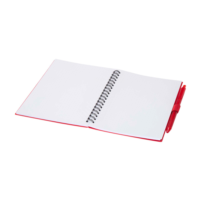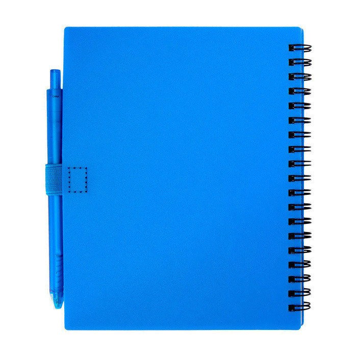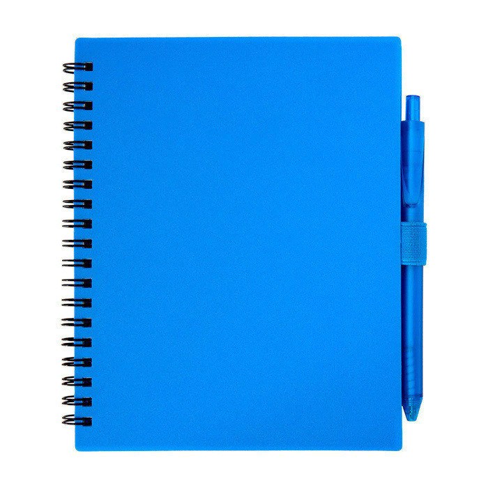 Carnet à couverture souple fabriqué en plastique recyclé avec 70 feuilles pointillées de papier 70 g/m². Coins arrondis, support pour stylo et stylo assorti en plastique recyclé inclus. Taille : 140 × 178 mm. Encre bleue, longueur d’écriture de 1000 m, pointe de 1,0 mm.