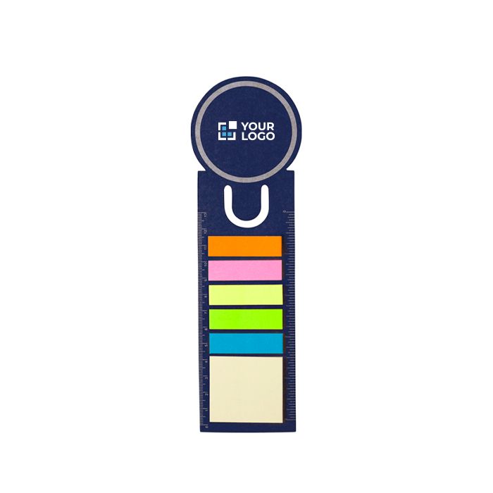 Marque-page en carton pratique avec bandes adhésives colorées intégrées.
