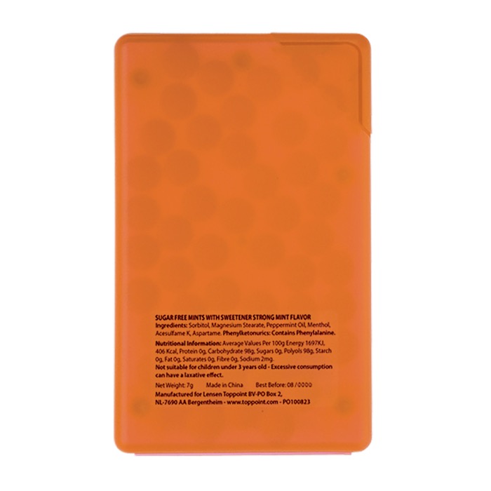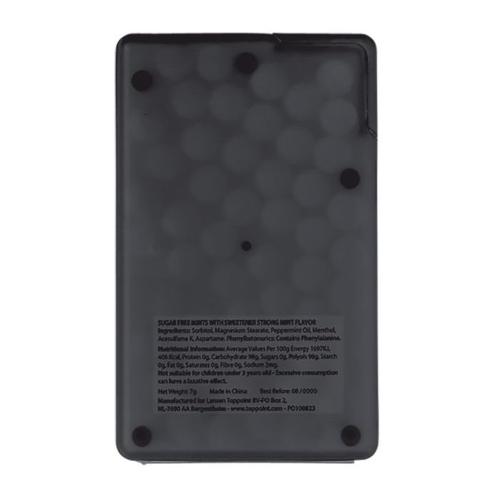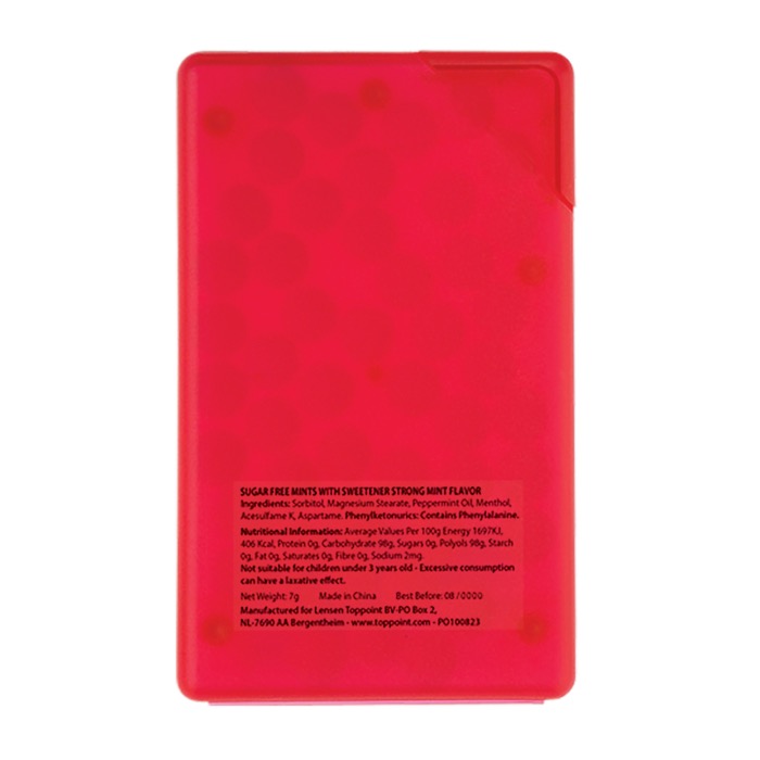 Un distributeur de pastilles sans sucre, disponible en plusieurs couleurs vives, apporte une touche de dynamisme à votre communication. Ce contenant personnalisable avec votre identité visuelle assure une présence joyeuse et fonctionnelle de votre marque. Boîte rectangulaire de bonbons à la menthe avec distributeur. Env. 7 grammes. Idéal pour égayer les bureaux, les salles de réunion ou les espaces d'accueil, il offre un rafraîchissement apprécié par tous. Ce support promotionnel pratique et esthétique renforce le sentiment de bien-être au sein de votre entreprise, contribuant à une image de marque moderne et attentionnée, tout en favorisant la mémorisation.