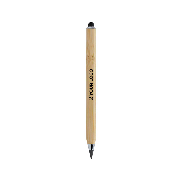 Stylo moderne fabriqué à partir de bambou certifié FSC®. Corps en forme de triangle avec un côté marqué en cm et un côté marqué en inches. Les crayons en bois traditionnels n'écrivent que jusqu'à environ 200 mètres, mais ce crayon infini sans arbre a une longueur d'écriture allant jusqu'à environ 20 000 mètres et utilise une pointe en graphite pour produire une ligne propre qui peut être effacé avec une gomme. Avec une pointe tactile pour utiliser son téléphone. Emballé dans un emballage FSC® mix.