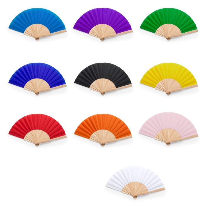 Éventail avec tiges en bambou et tissu en polyester en couleurs