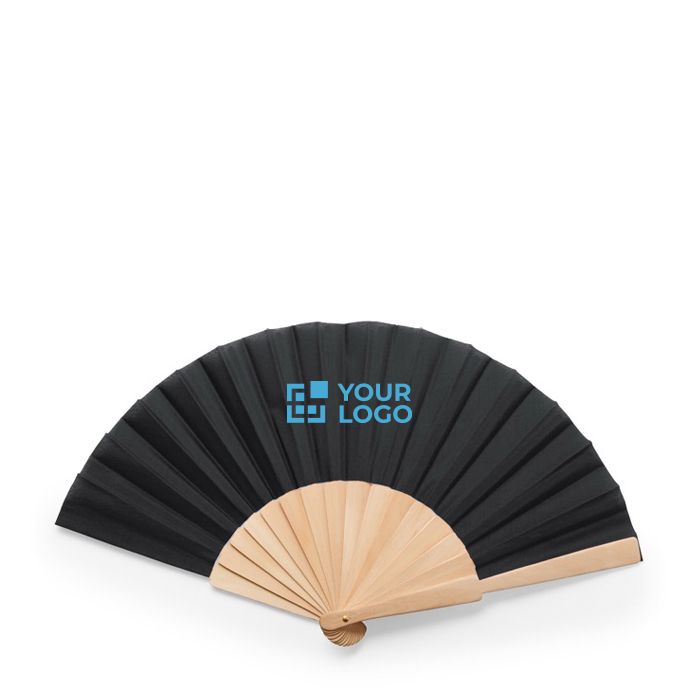 Éventail élégant alliant tissu polyester et tiges bois naturel.