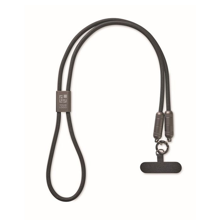 Lanière pratique avec câble de charge 60W inclus, personnalisable facilement.