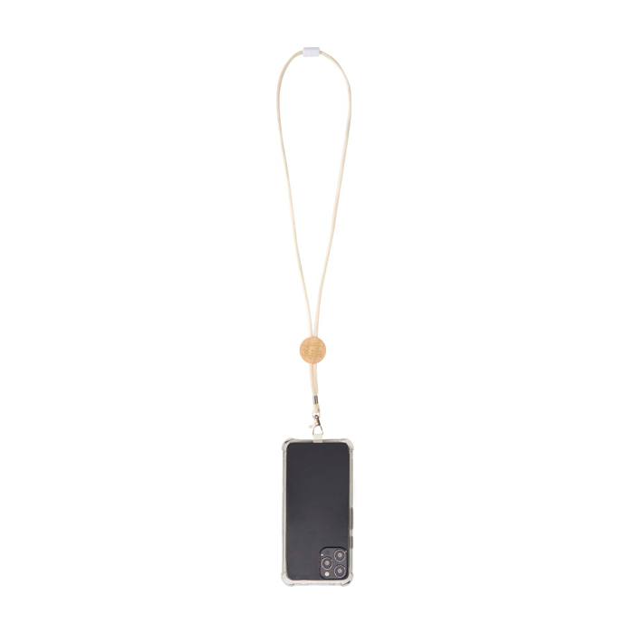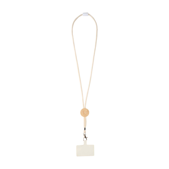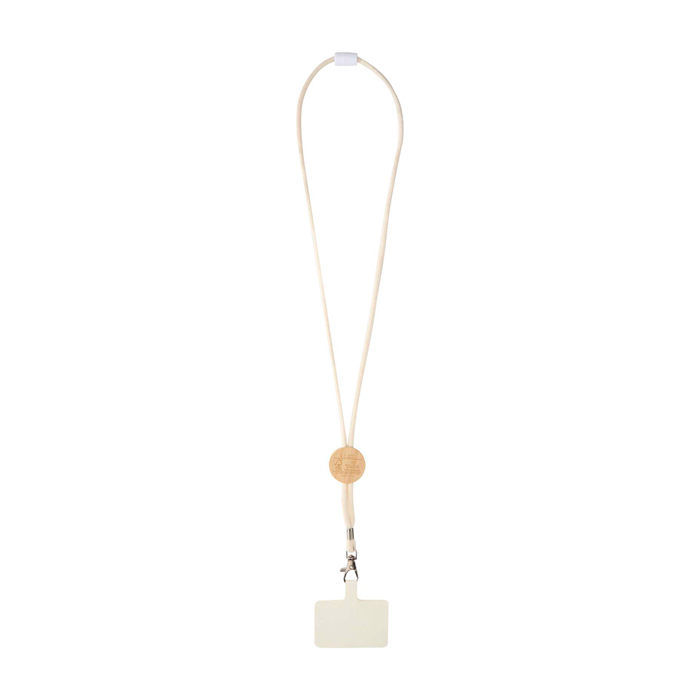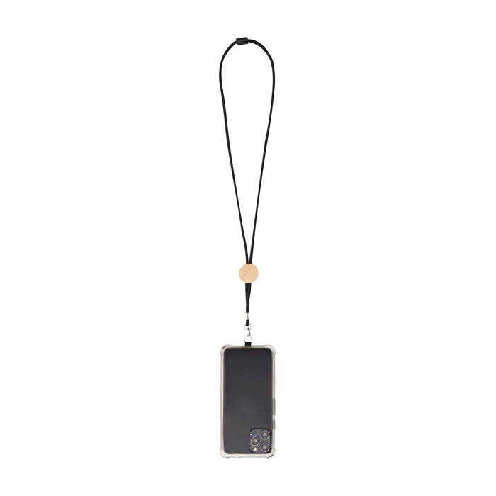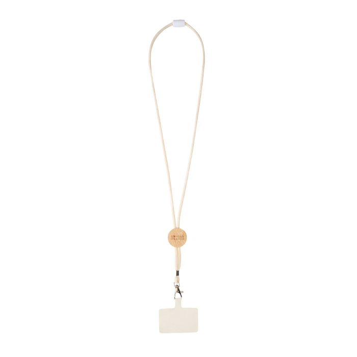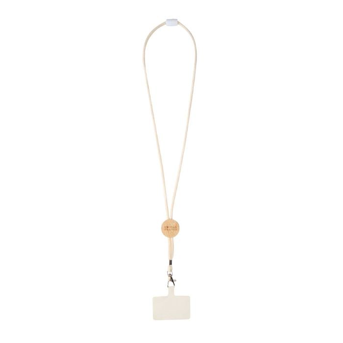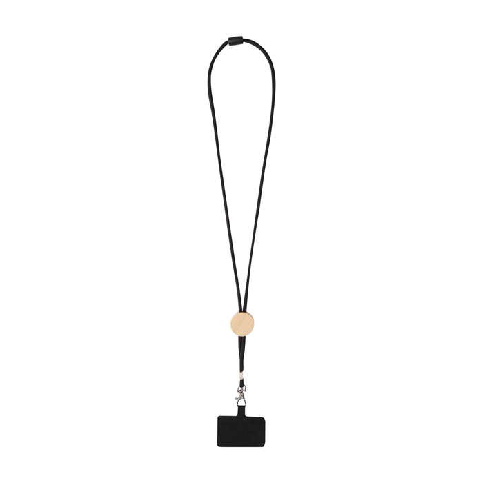 Tour de cou pour smartphone avec pièce centrale en bambou d’origine responsable, finition naturelle et surface marquable pour le logo, pratique pour un usage quotidien et les événements.