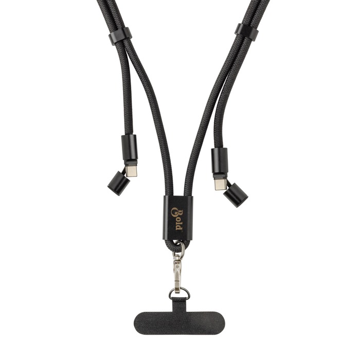 Un tour de cou innovant pour téléphone, fabriqué en RPET et intégrant un câble USB-C de charge rapide 60W, offre une gestion optimale des appareils. Il combine la sécurité anti-chute avec la capacité de transfert de données et de recharge, assurant une efficacité professionnelle. Cet accessoire maintient le téléphone accessible et sécurisé. Votre marque est ainsi associée à une solution à la fois pratique et respectueuse de l'environnement, renforçant la perception d'une entreprise avant-gardiste et soucieuse du bien-être de ses utilisateurs.