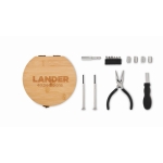 Coffret d'outils présenté dans un étui en bambou contenant 9 embouts, 2 embouts Philips (PH1, PH2) et 1 adaptateur, 4 douilles, 1 manche, 1 connecteur, 1 pince à bec et 2 tournevis de précision.