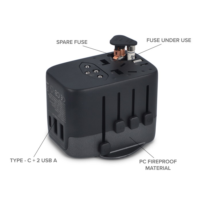 Adaptateur de voyage universel pour plus de 150 pays. Son design compact et son poids léger (seulement 140 g) le rendent idéal pour voyager léger. Équipé d’un obturateur de sécurité, d’une protection contre les prises uniques et de fonctions anti-choc, il est sûr pour les enfants, parfait pour voyager en famille sans souci. Fabriqué en plastique recyclé.