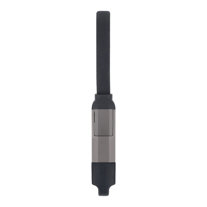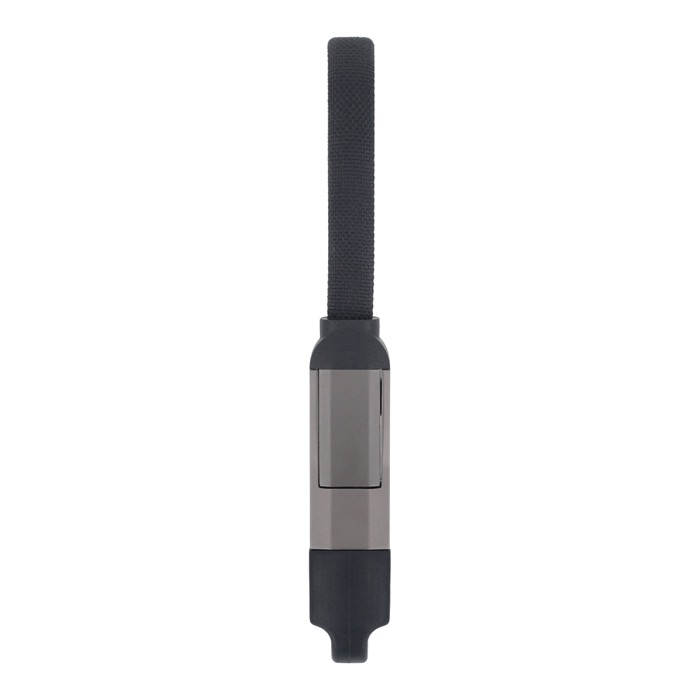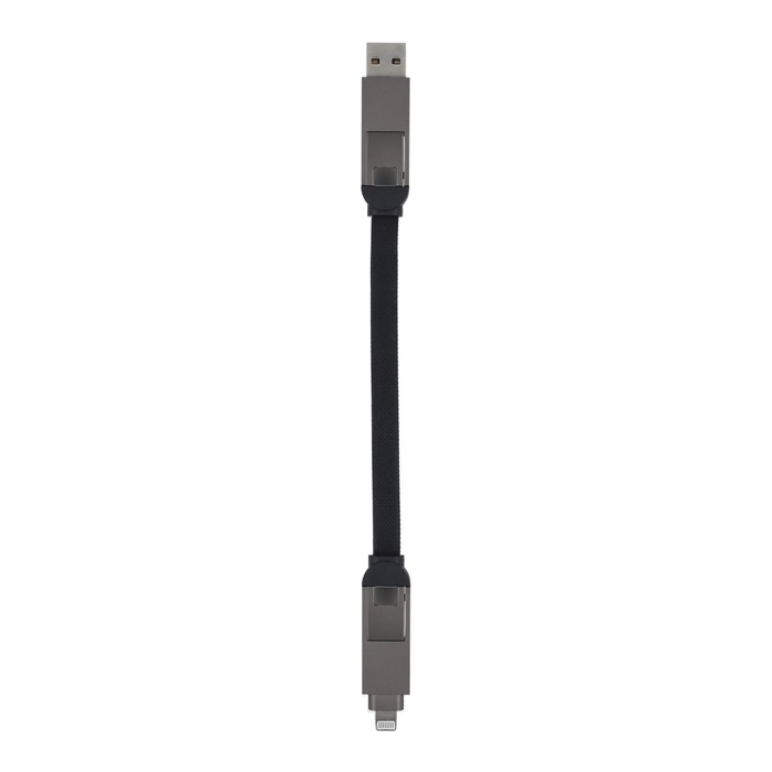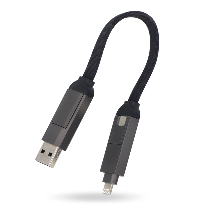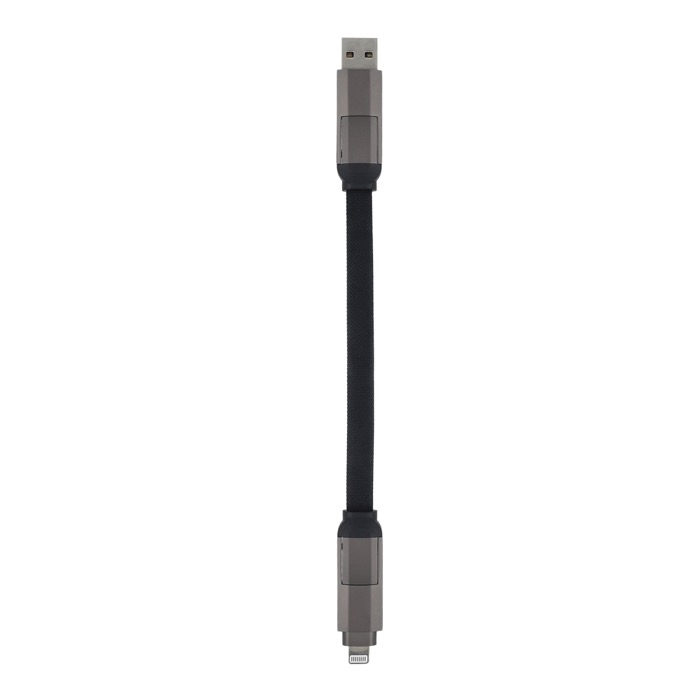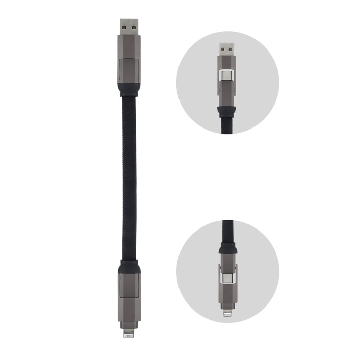 Ce câble multifonction avec entrées USB-A et USB-C, sorties USB-C et Lightning, supporte PD et QC. Son nylon tressé est durable et la fermeture magnétique le maintient organisé, idéal à emporter.