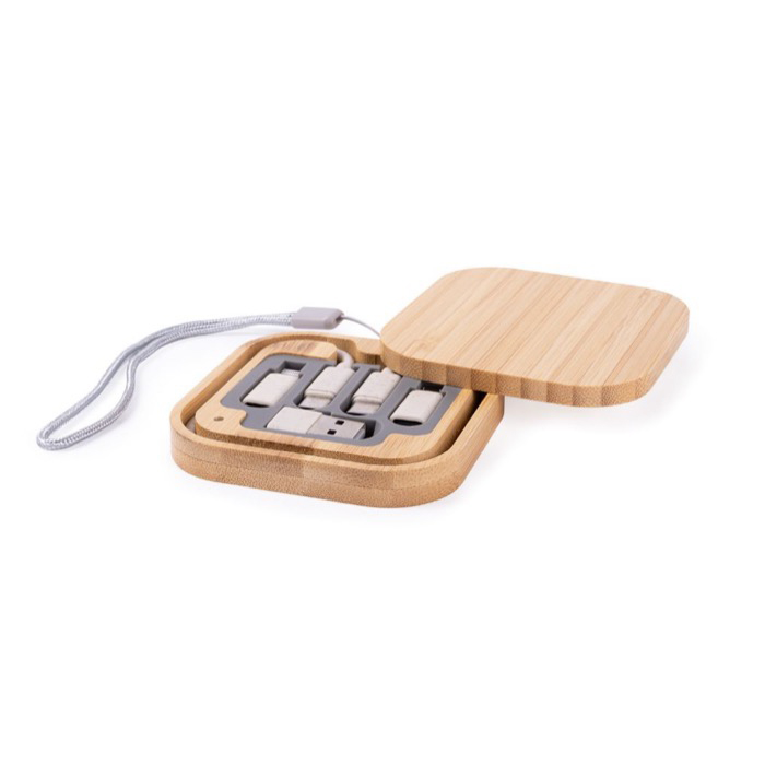 Set de câbles 5V 2A présentés dans une élégante boîte en bambou à fermeture magnétique. Connecteurs USB, Type-C, Lightning et micro USB inclus.