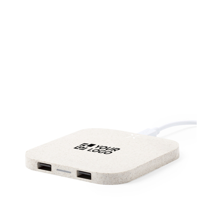 Chargeur sans fil avec boîtier en fibre de blé. Double sortie USB, capacité de 2 100 mAh, permettant de charger simultanément jusqu’à 3 appareils (1 par charge sans fil et 2 via câble). Base antidérapante.