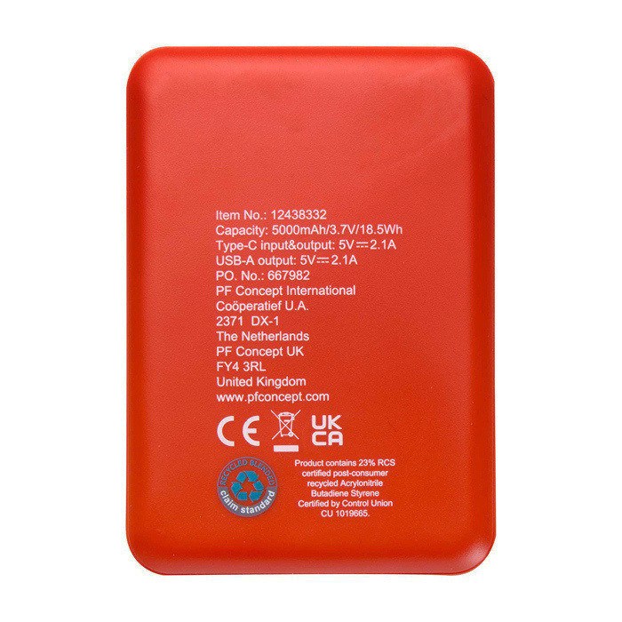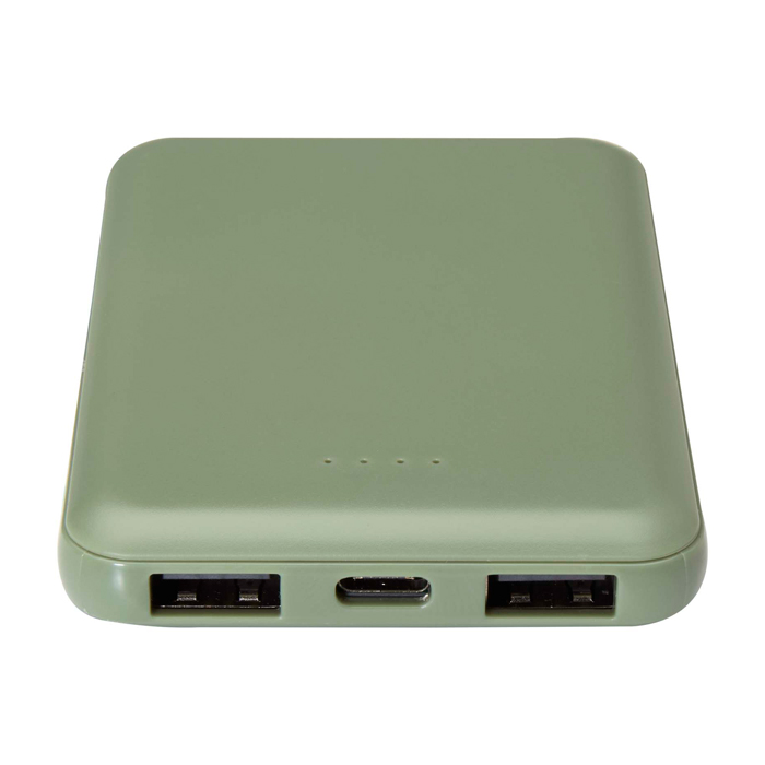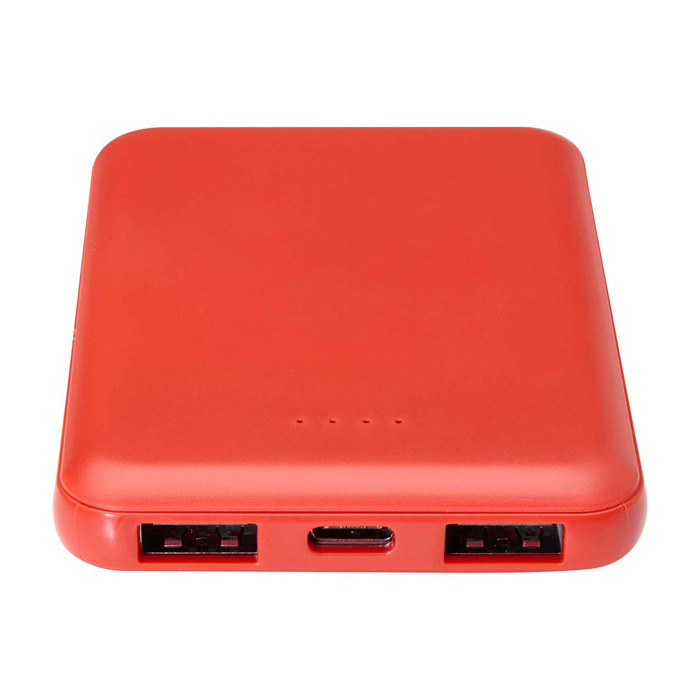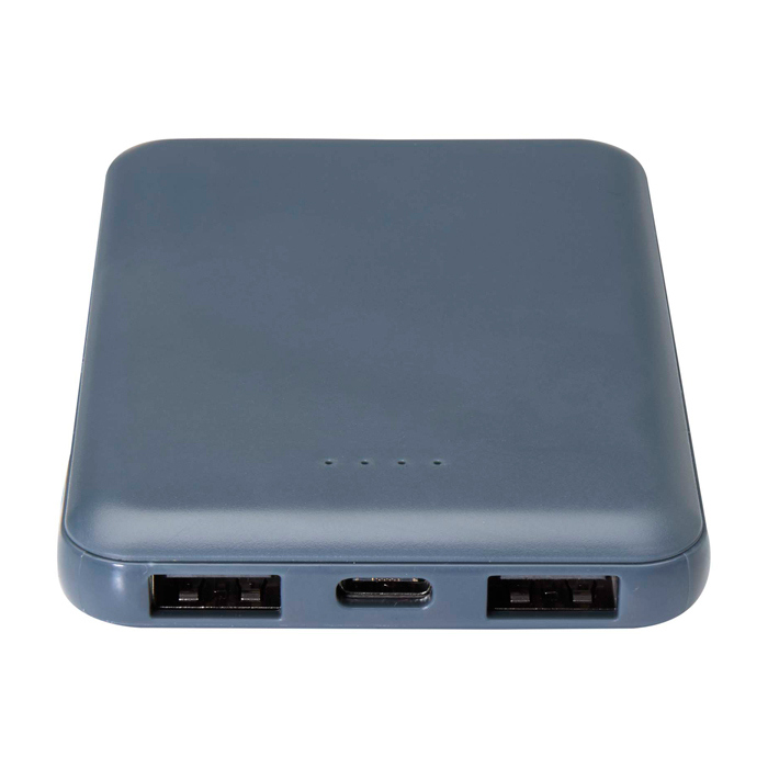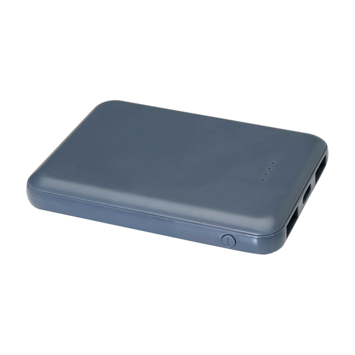 Batterie de secours au design fin et élégant dotée d'un port d'entrée/de sortie de type-C et de 2 ports USB-A, permettant de charger 3 appareils simultanément. La batterie de secours est équipée d'une batterie lithium-polymère de 5 000 mAh qui délivre une puissance de sortie totale de 10 W maximum. Cette batterie de secours est fabriquée à 23 % de plastique recyclé certifié RCS. Livrée avec un câble de charge TPE de type-C vers USB-A.