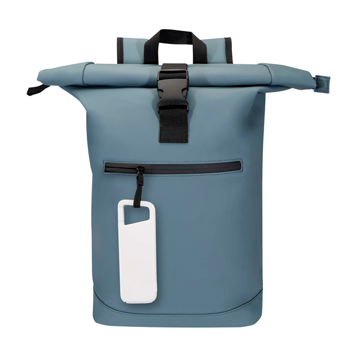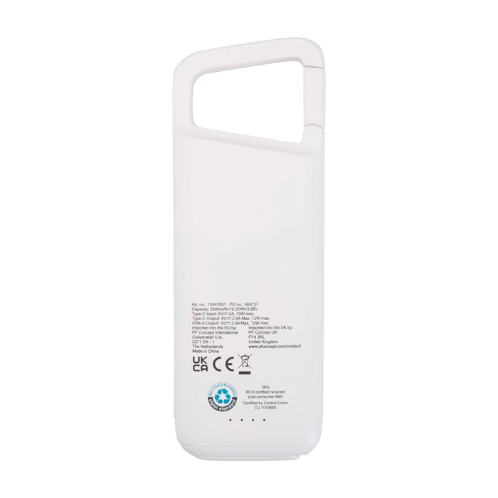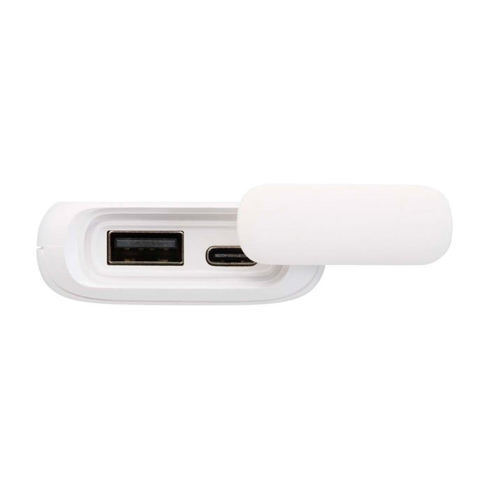 Batterie externe de 5 000 mAh fabriquée en plastique recyclé, au design résistant à l’eau IPX5 (supporte la pluie et les jets d’eau à basse pression), avec mousqueton intégré pour l’attacher facilement, ports USB protégés par un capuchon en silicone et indicateur LED de charge ; conçue pour une utilisation en extérieur, lors d’excursions ou dans les déplacements quotidiens.