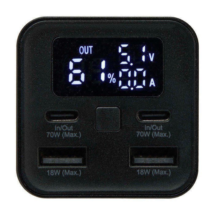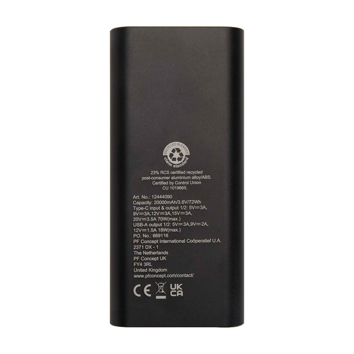 Batterie externe de 20 000 mAh fabriquée en aluminium recyclé. Dispose de deux ports USB-C de 70 W et deux USB-A de 18 W, adaptés pour charger ordinateurs portables, tablettes et smartphones. Écran intégré affichant en temps réel le pourcentage de charge et la puissance délivrée. Inclus câble USB-C de 70 W pour utilisation ou recharge directe.