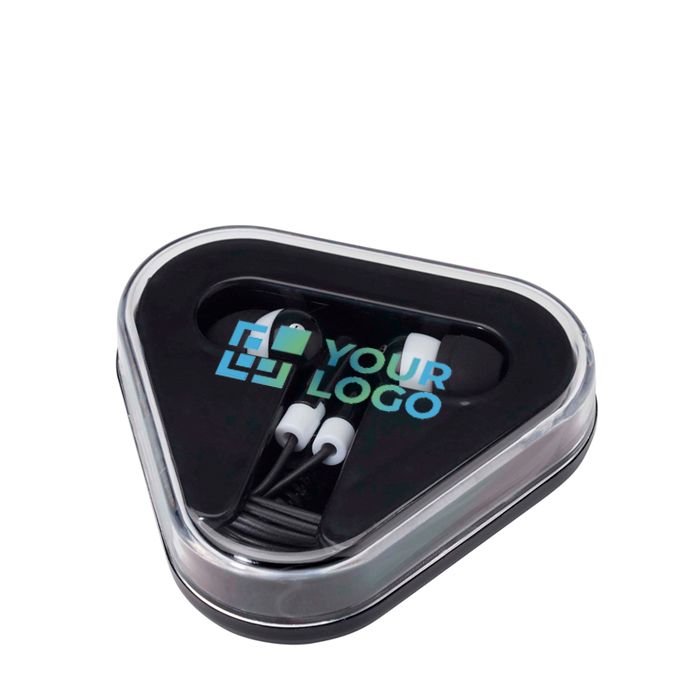 Écouteurs simples avec étui triangulaire, compacts et pratiques partout.