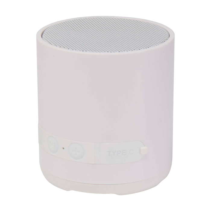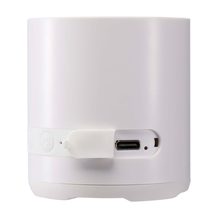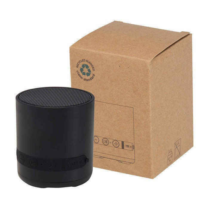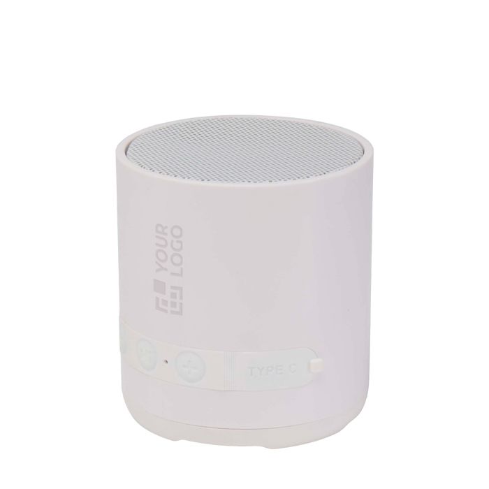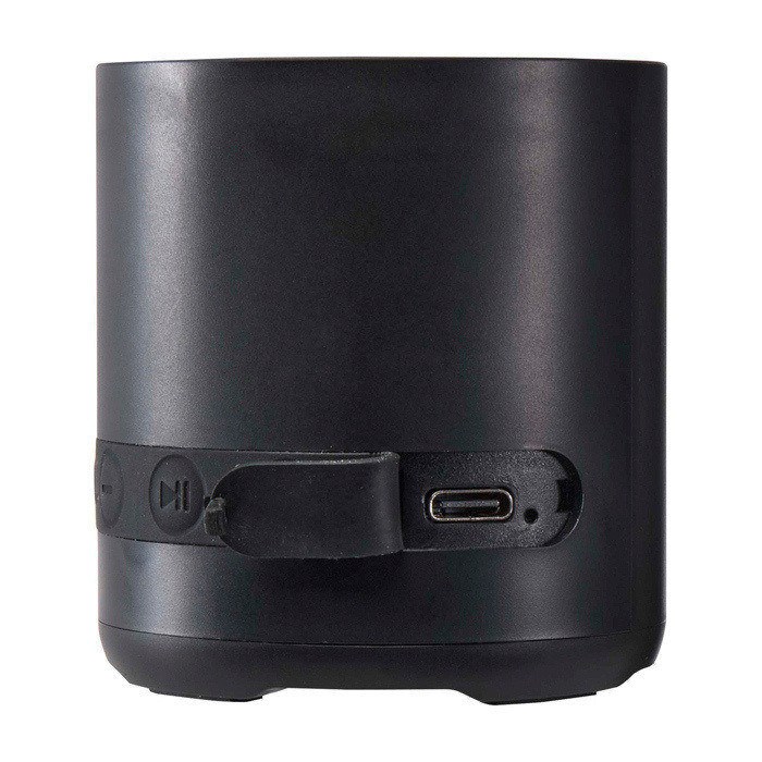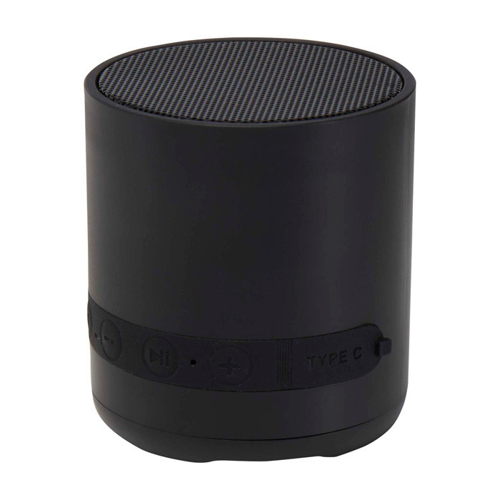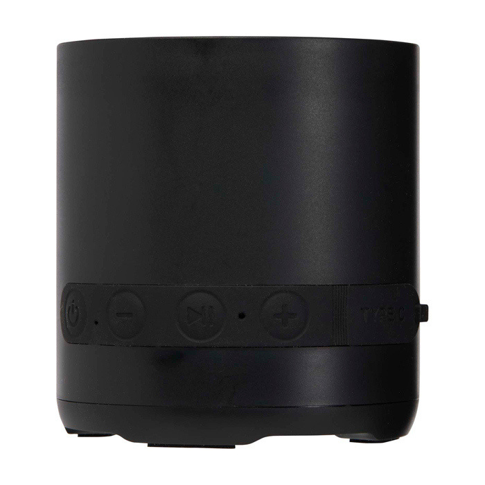Enceinte sans fil Bluetooth® de 3 W fabriqué en plastique recyclé ; comprend un port de charge USB-C, des boutons de volume, un bouton lecture/pause/appel, un microphone intégré, et prend en charge la fonction TWS pour jumeler deux enceintes et obtenir un son stéréo.