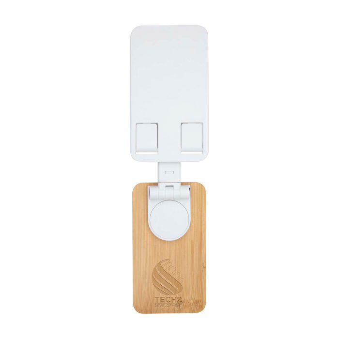 Support pour téléphone fabriqué en plastique recyclé et bambou issu de sources responsables, avec hauteur et angle réglables pour un visionnage confortable ; adapté à un bureau ou espace de travail, offrant une stabilité optimale au dispositif.
