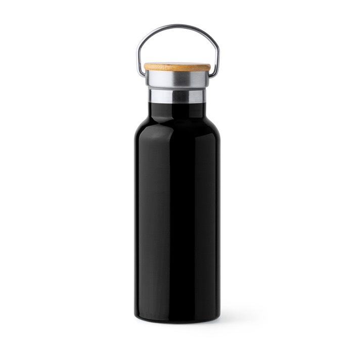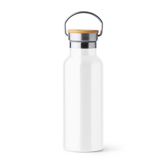 Gourde en acier inoxydable 304 double paroi avec bouchon en bambou. Capacité 500 ml. Possibilité de sublimation sur couleur blanche. Anse métallique pliable. Disponible en grande variété de couleurs.