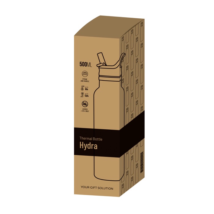 Bouteille thermos double paroi en acier inoxydable, avec revêtement en poudre garantissant résistance, durabilité et finition esthétique sophistiquée. Couvercle hermétique en polypropylène avec anse fixe et paille rabattable, offrant praticité et sécurité, tandis que la base en EVA assure adhérence et protection antidérapante. Capacité 500 ml, présentée dans un emballage individuel en boîte kraft, adaptée pour usage quotidien ou cadeau.
