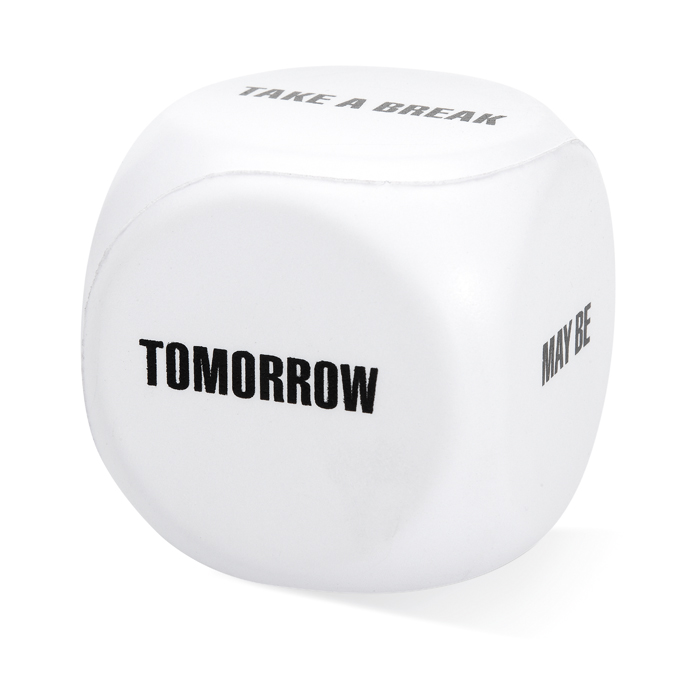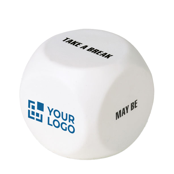 Misez sur ce dé anti-stress en PU et offrez un détail amusant à vos clients et employés. En effet, ce produit conçu pour réduire la tension lors de périodes de forte charge de travail vous aidera également à prendre des décisions et à vous détendre l'esprit. Pour cela, il vous suffit de lancer le dé et de voir laquelle de ses indications apparaît : Take a break, tomorrow, may be, yes, no. De plus, la sixième face est vide afin que vous puissiez la personnaliser avec votre logo, que ce soit par gravure ou par impression, même en réalisant des designs en couleur.