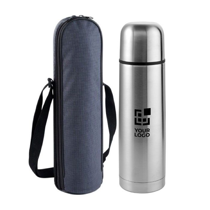 Thermos inox 750 ml pratique avec housse et bandoulière.