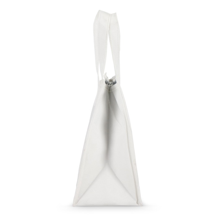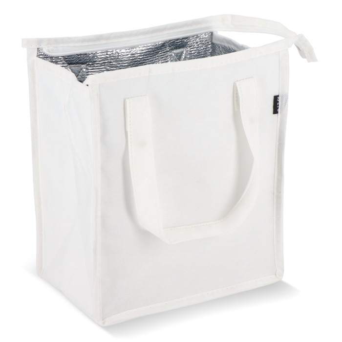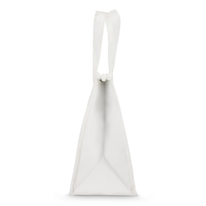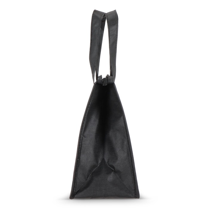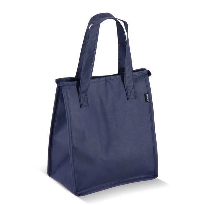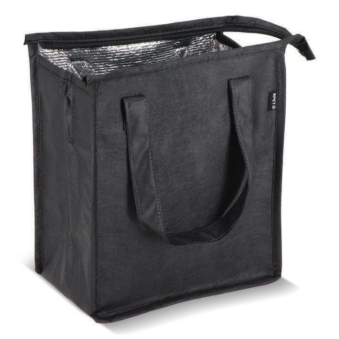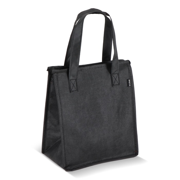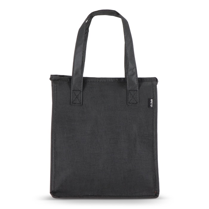 Sac isotherme pour déjeuner fabriqué en matériau non tissé PET recyclé (75 g/m²) avec doublure en papier aluminium. Compact et pratique.