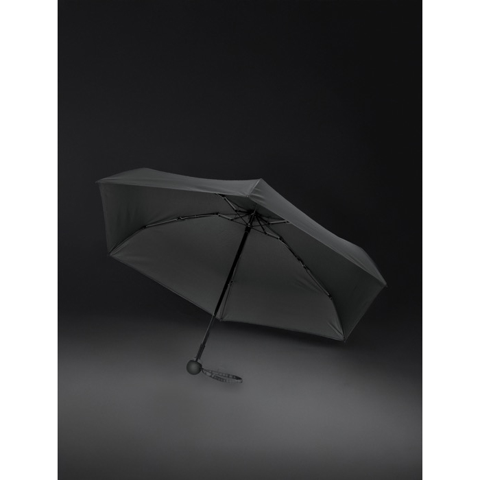 Mini-parapluie manuel fabriqué en tissu 100 % rPET 190T pongé avec traceur AWARE™, garantissant l’usage de matériaux recyclés authentiques. Il comprend cinq sections qui le rendent ultra-compact et facile à transporter dans un sac ou une poche, tout en s'étendant pour offrir une couverture complète. Sa structure combine une poignée et des baleines en acier, avec 8 baleines en fibre de verre à double section, offrant résistance au vent. Système d’ouverture et fermeture manuelle, avec poignée en PP recouverte de PU pour une prise confortable. Inclut un passeport numérique de produit. Sans PVC, présenté individuellement dans un sac en polyéthylène avec numéro de lot PU.