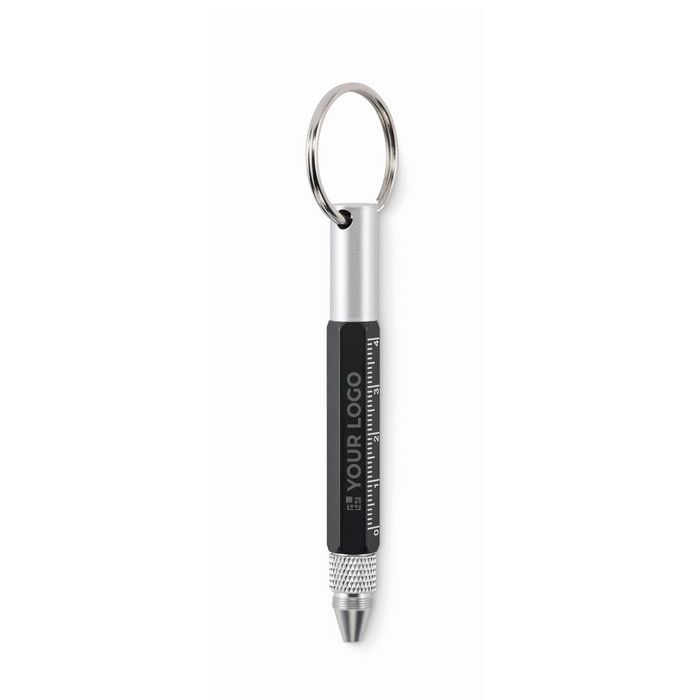 Porte-clés multifonction avec stylo noir, outils pratiques inclus.