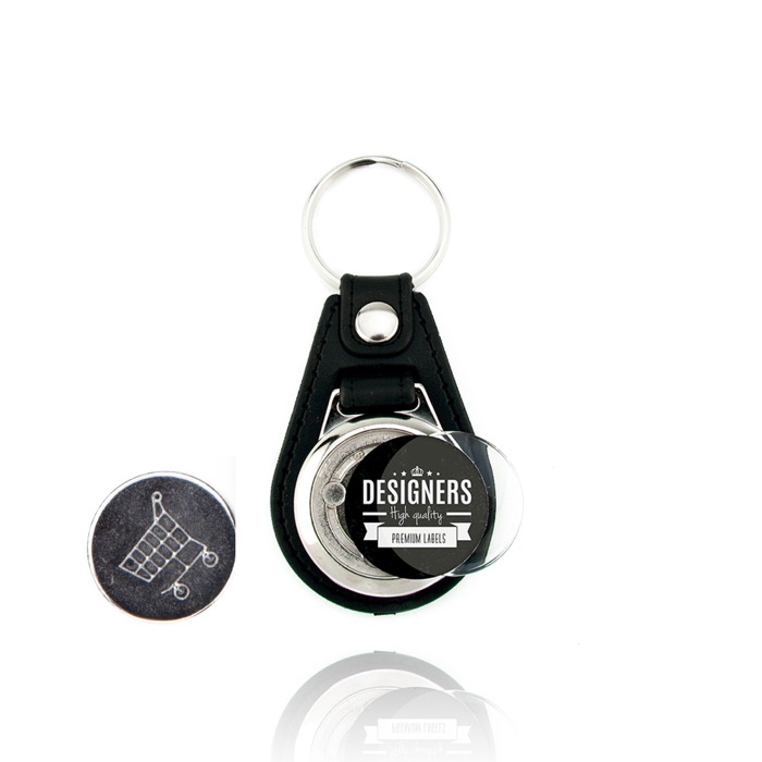 Porte-clés en métal et PU, avec fiche de 1,00 € pour le panier. Personnalisé sur 1 face avec insert en papier (Ø25mm) et couvercle en acrylique.