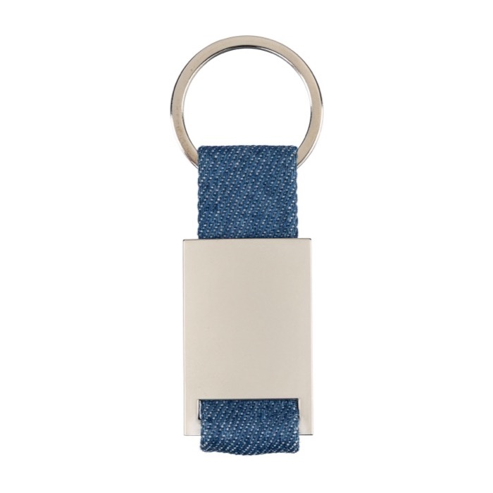 Porte-clés en denim et alliage de zinc avec anneau métallique. Présenté dans une pochette en papier kraft, ce détail renforcera la visibilité de votre marque.
