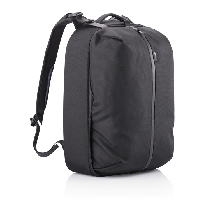 Sac d'affaires avec poche frontale extensible, de 16 à 24 litres. Design antivol sans accès frontal et fermetures éclair cachées dans le compartiment principal pour plus de sécurité. Poche protégée avec RFID à l'arrière. Port de charge USB rapide sur la sangle où se trouve également un support pour lunettes de soleil. Fabriqué avec des matériaux RPET et technologie AWARE™ (garantie d'utilisation de matériaux recyclés et de réduction d'eau pour sa production).