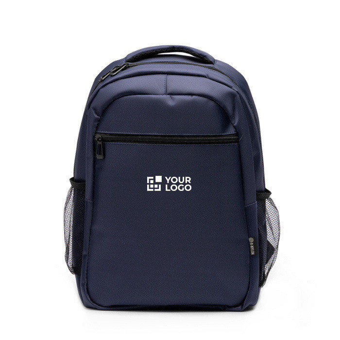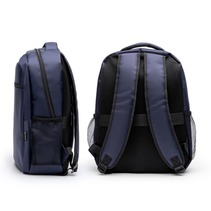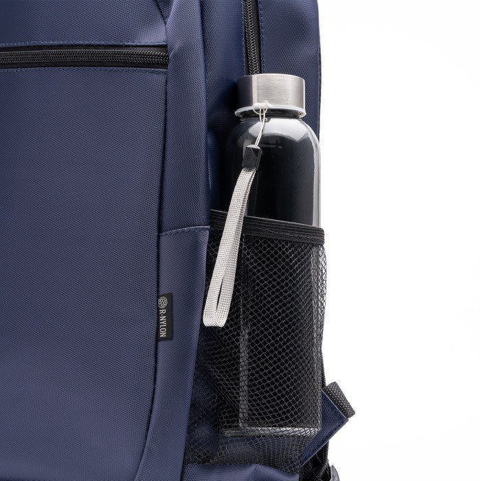 Sac à dos business en nylon recyclé, grand compartiment principal et poche rembourrée pour ordinateur portable 15”. Poche extérieure et deux poches latérales, anses et dos rembourrés. Comprend sangle pour valise.