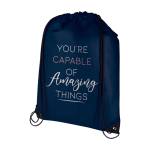 Un sac à dos à cordon en RPET non-tissé durable et résistant à la déchirure, d'une capacité de 5 litres, représente un support publicitaire efficace et économique. Sa légèreté et sa robustesse le rendent pertinent pour une utilisation quotidienne, du transport de documents à celui d'affaires de sport. Doté d'un cordon de serrage, il peut être porté facilement à l'épaule ou en sac à dos. Ce sac est couramment distribué lors de salons, de conférences ou d'événements promotionnels. En l'offrant, votre entreprise assure une visibilité maximale de son logo auprès d'un large public, renforçant la reconnaissance de marque et cultivant une image accessible et fonctionnelle pour votre entreprise. Capacité de charge maximale de 5 kg.