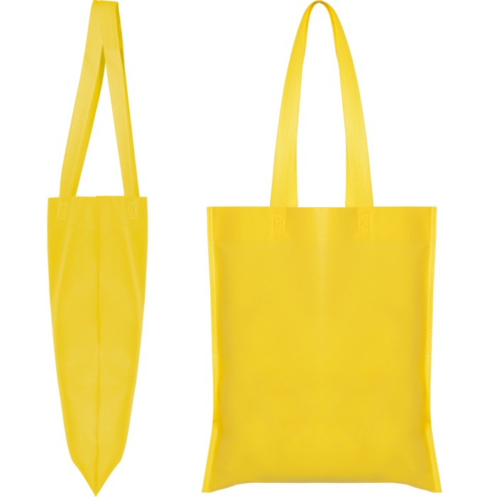 Sac thermoscellé sans soufflet, confectionné en tissu non tissé, avec longue anse de 70 cm assortie à la couleur du sac. Supporte jusqu’à 6 kg.