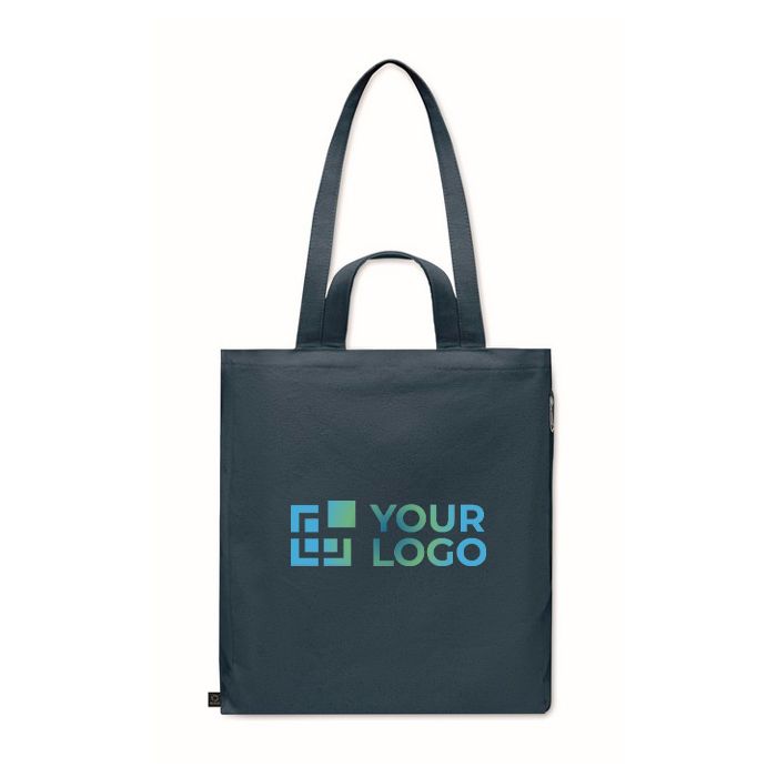 Sac de courses solide en coton recyclé avec poche latérale pratique.