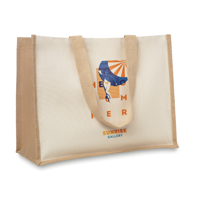 Optimisez votre stratégie marketing avec ce sac shopping, un best-seller alliant résistance, durabilité et style. Fabriqué en toile et jute, son intérieur laminé garantit durabilité, tandis que ses longues anses en coton offrent un confort optimal à chaque utilisation. Cette pièce unique, disponible en livraison express, est parfaite pour mettre en avant vos campagnes publicitaires et offrir à vos clients un cadeau pratique et utile. Sous un design bicolore, le jute, réputé pour sa résistance et son esthétique naturelle, s'associe à la touche moderne de la toile pour créer un produit visuellement attrayant. Ainsi, avec ce sac, vous renforcez efficacement et respectueusement votre marque, laissant une impression positive et durable à chaque interaction.