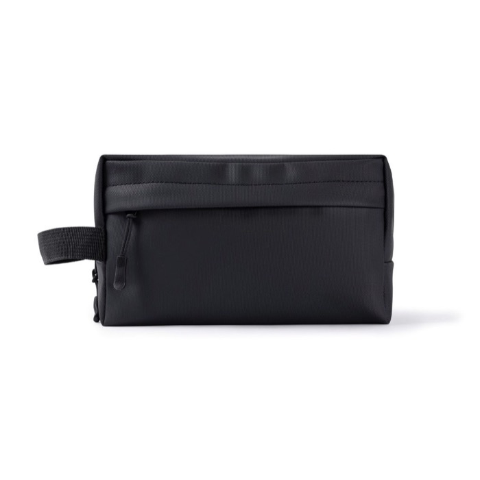 Trousse spacieuse avec poignée latérale et poche extérieure, conçue pour transporter petits objets. Sa résistance de 500 g/m² garantit durabilité.