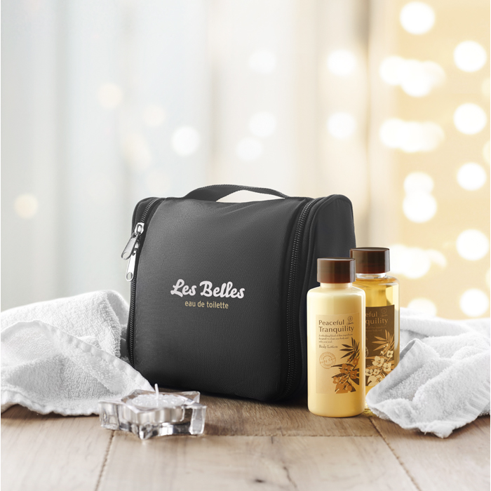 Grande trousse de toilette publicitaire de voyage avec plusieurs sections. Elle peut être personnalisée avec la marque de l'entreprise pour offrir aux clients.